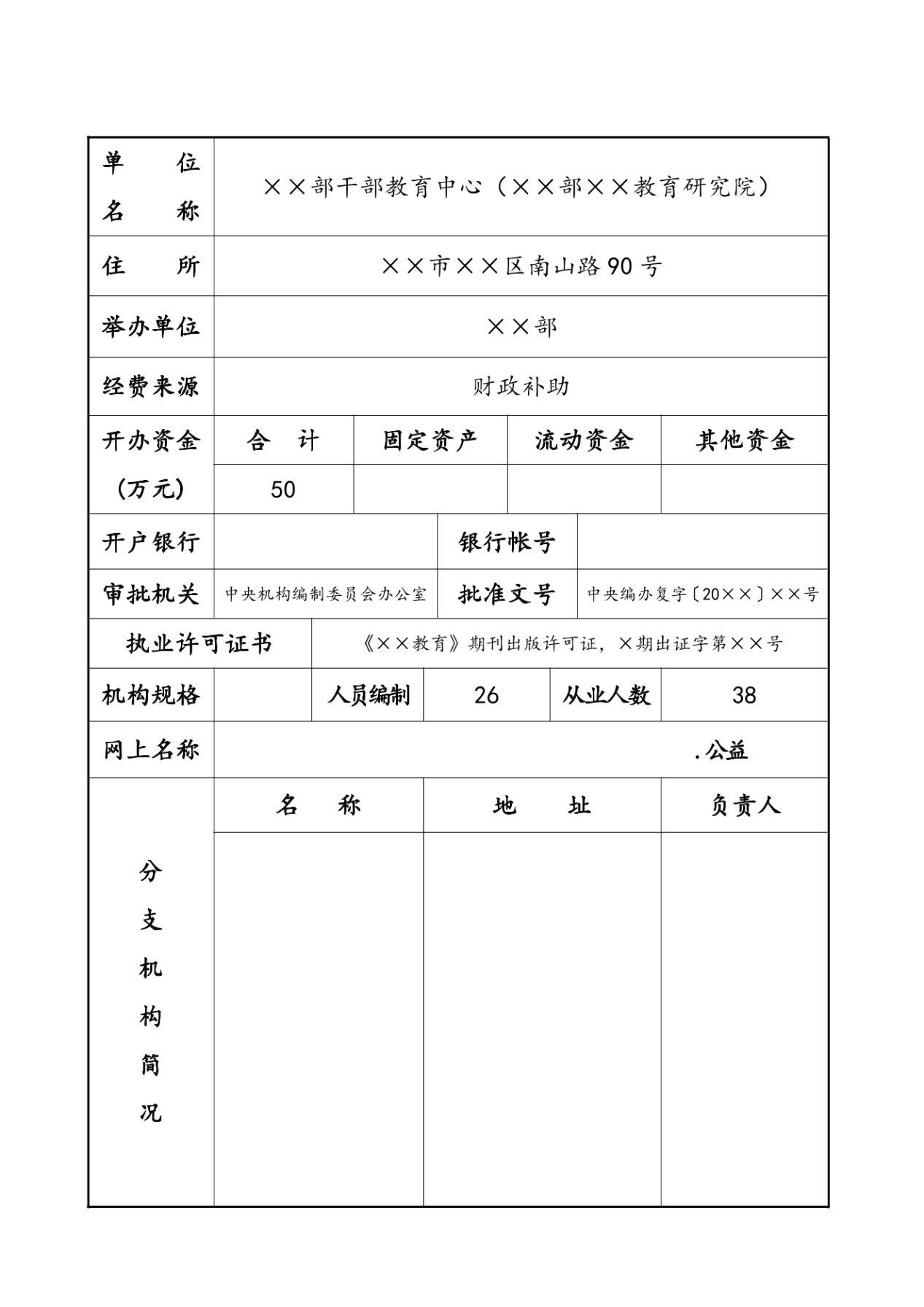 2 | 事业单位法定代表人登记申请表 | 原件 | 3 | 纸质 | 登录“江苏省机关赋码和事业单位登记管理系统”,按规定填写完整,市、区登记管理机关初审通过后,下载打印,粘贴二寸免冠照片,由举办单位盖章确认。 |